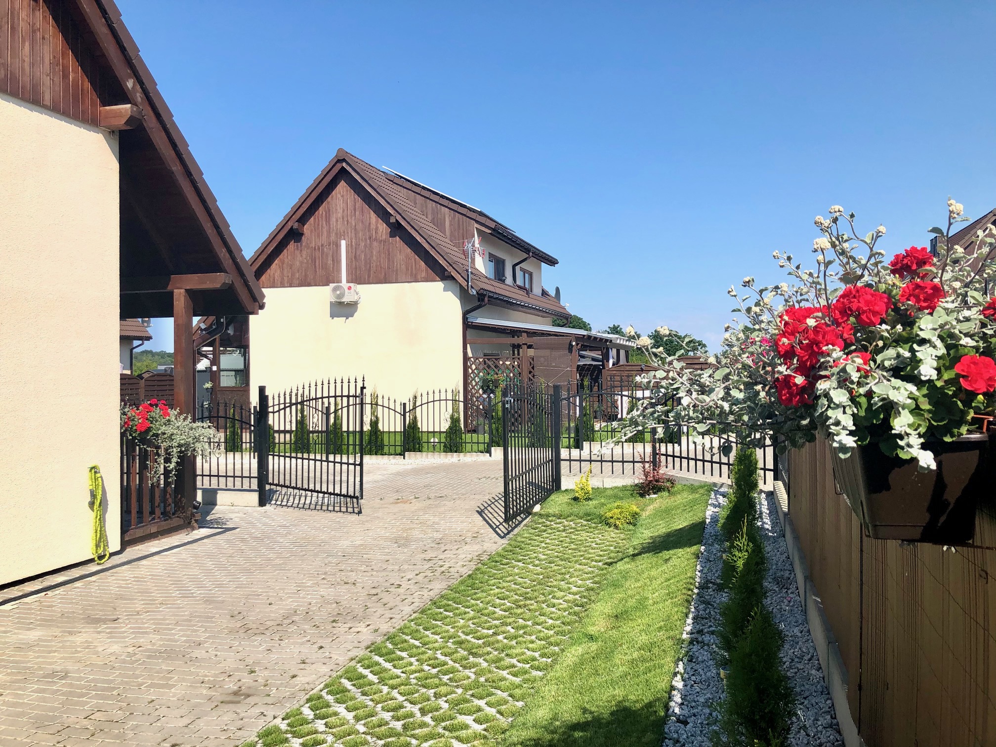 Domek jest ogrodzony z trzech stron szczelnym płotem, a od frontu posiada metalową bramę i przęsła dodatkowo zabezpieczone siatką.